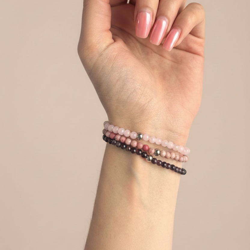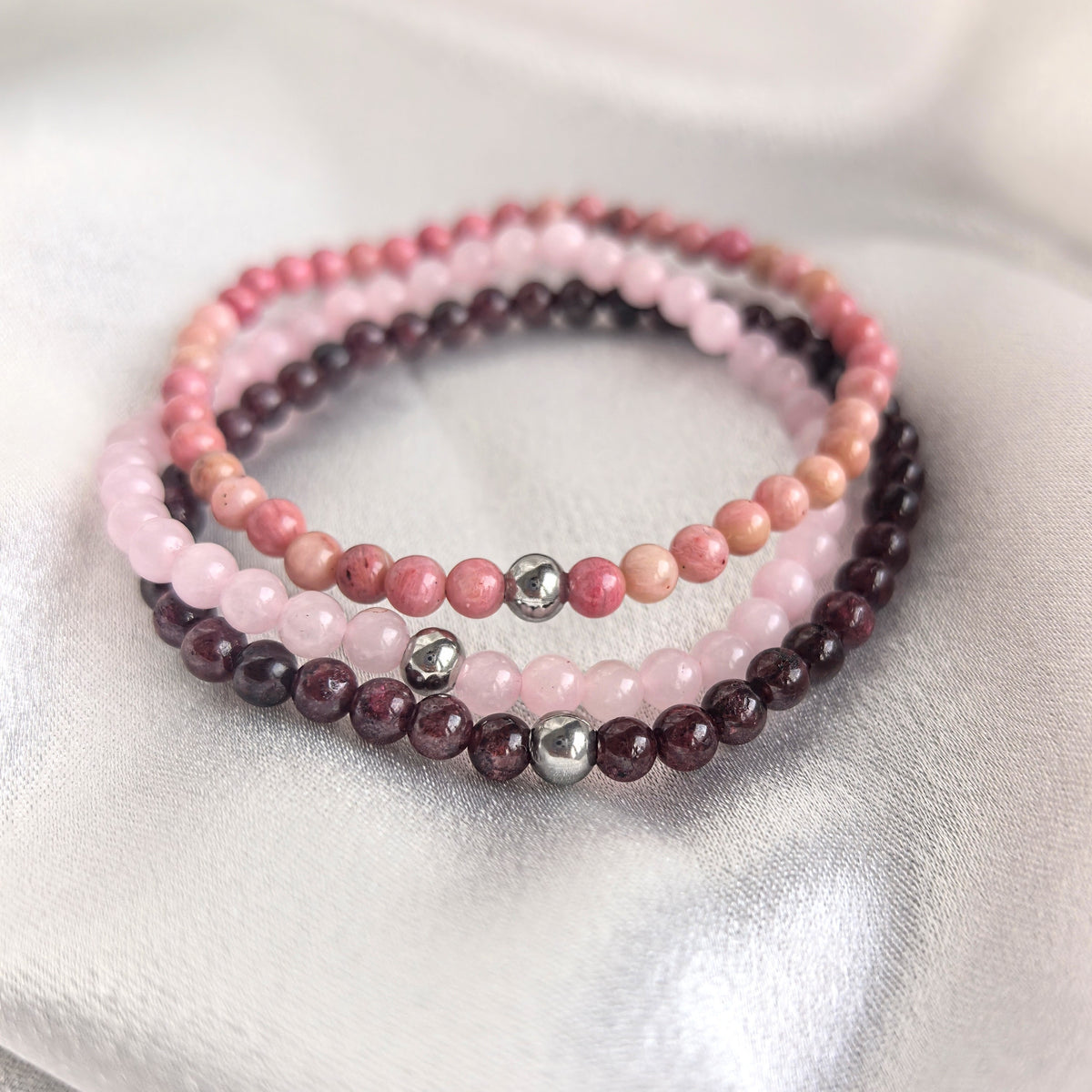 Силата на тройната комбинация – Розовият кварц изпълва сърцето с любов, Родонитът го лекува и стабилизира, а Гранатът разпалва вътрешната ти сила, за да излъчваш увереност и привлекателност. Заедно създават хармонична енергия, която подкрепя любовта във всичките ѝ форми.