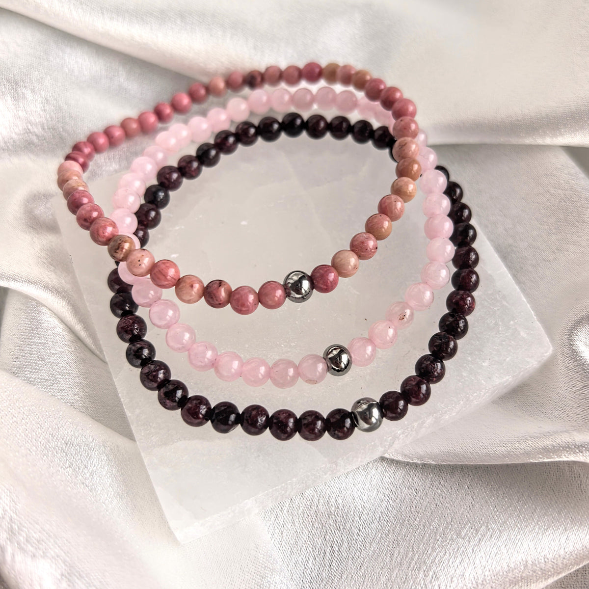 Този нежен енергиен сет съчетава три от най-силните кристали за любов, емоционална сила и вътрешна увереност – Розов кварц, Родонит и Гранат. Създаден е, за да подкрепя сърцето ти, да засилва женската ти енергия и да ти помага да излъчваш любов – както към себе си, така и към света около теб.