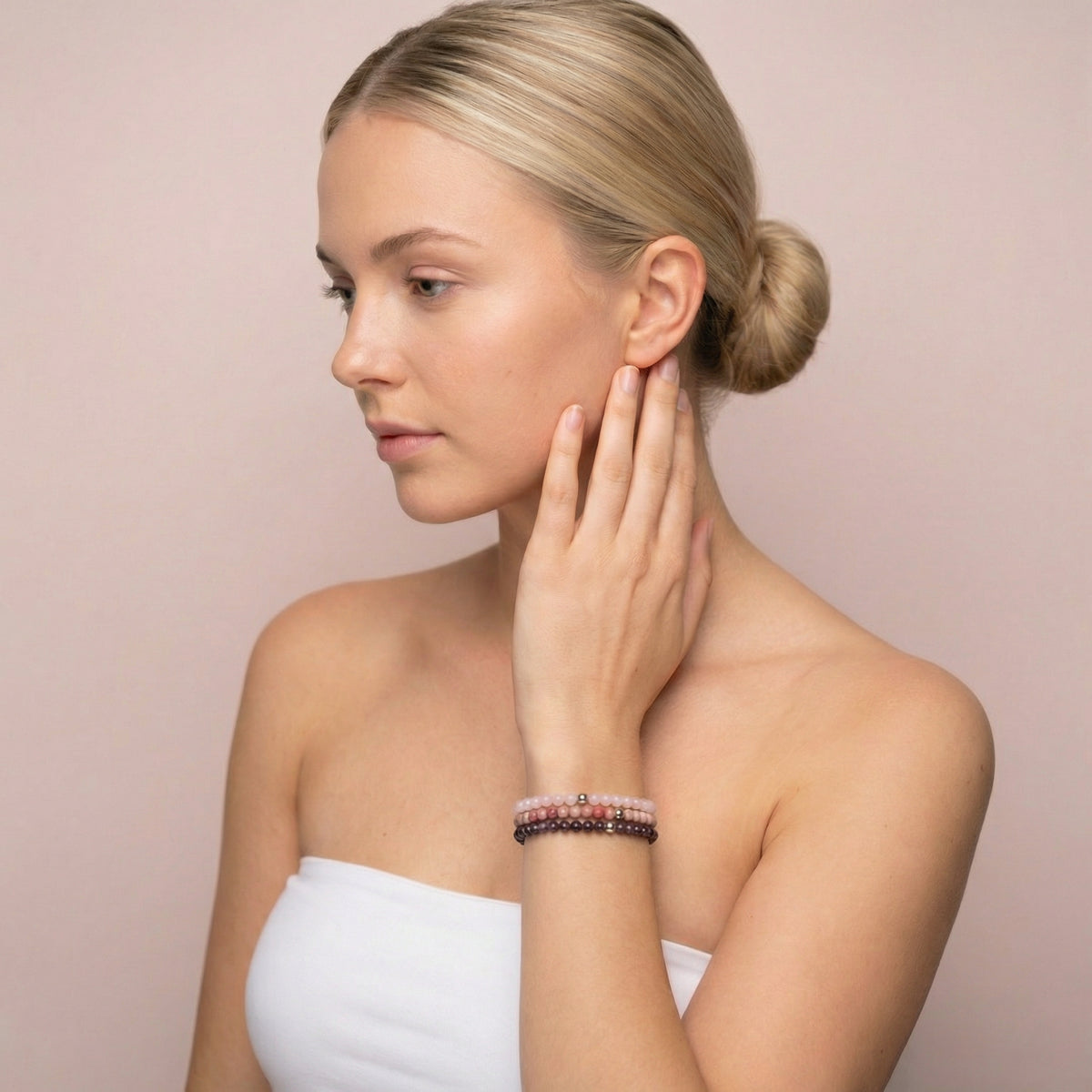 Този нежен енергиен сет съчетава три от най-силните кристали за любов, емоционална сила и вътрешна увереност – Розов кварц, Родонит и Гранат. Създаден е, за да подкрепя сърцето ти, да засилва женската ти енергия и да ти помага да излъчваш любов – както към себе си, така и към света около теб.